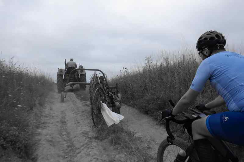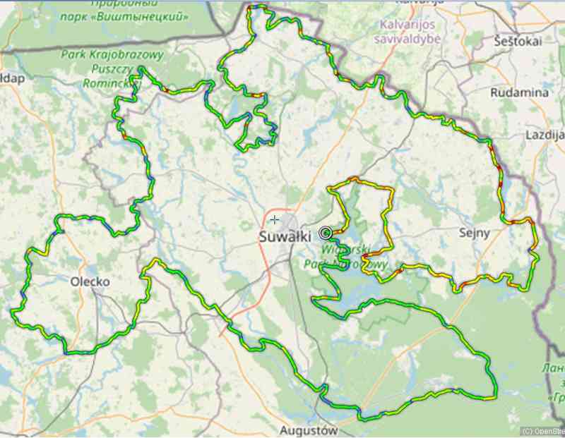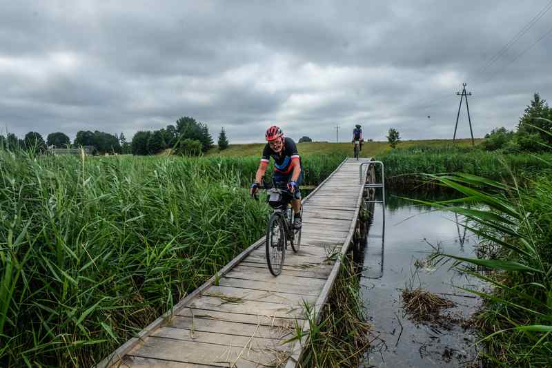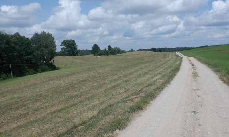Od dłuższego czasu jadę śladem poprowadzonym wzdłuż północno-wschodniej granicy państwa. Polne drogi to zbliżają się to oddalają od pasa granicznego oddzielającego dwa państwa. Pola, łąki, lasy. W oddali widać białe słupki graniczne. Z bliska można zobaczyć flagę, herb i odczytać napis Lietuvos Respublika. Od dłuższego czasu mijam nadjeżdżających z przeciwka uczestników trasy krótkiej. Niektórzy bardzo zdziwieni, że jadę w przeciwnym kierunku.
