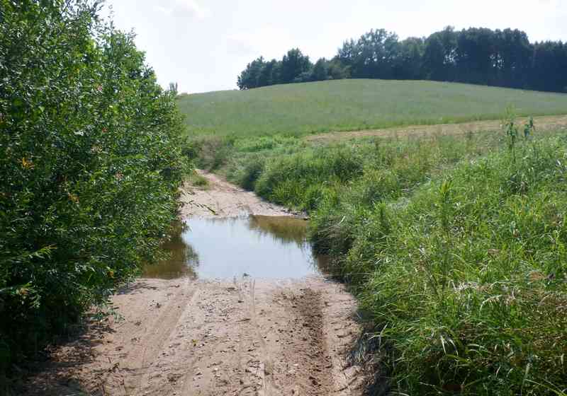 Zjazd w dolinę. Już z oddali widać wodną przeszkodę. Bez przekonania myślę o czekającej przeprawie. Odciśnięte w piachu samochodowe i rowerowe opony wskazują, że jest to możliwe. Widok jaki zobaczę będąc na drugim brzegu musi wywołać uśmiech. Na skraju "kałuży" widzę sięgajšcy kostek strumyk i dwa kamienie możliwe do pokonania nawet przez dziecko.