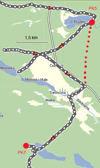 Opuszczam przepust i jadę wijącą się leśną drogą prowadzącą mniej więcej na południe. Mijam widoczną na szosę. Dotarcie do mostu wydaje się na tyle proste, że nie spoglądam na kompas, nie sprawdzam pokonanego dystansu. Pomimo, że dawno powinienem minąć most nad ciekiem wodnym, żadnego obniżenia terenu nie widzę. Wracam do pierwszych zabudowań i koryguję kierunek jazdy. Tym razem zatrzymuję się na skraju jakiegoś jeziora. Nie jest dobrze, tego jeziora nie mam na mapie. Nie wiem gdzie jestem i tu się tego nie dowiem. Wracam szybko do asfaltowej drogi. Napis na sklepie - Rybakowo - wyjaśnia wszystko. Zaraz za przepustem, przy którym odnalazłem PK7, było rozwidlenie dróg i wybrałem tę, która tylko "mniej więcej" prowadziła na południe, a w rzeczywistości skręcała delikatnie na południowy-wschód.
