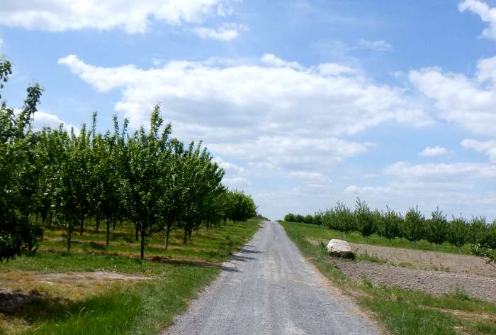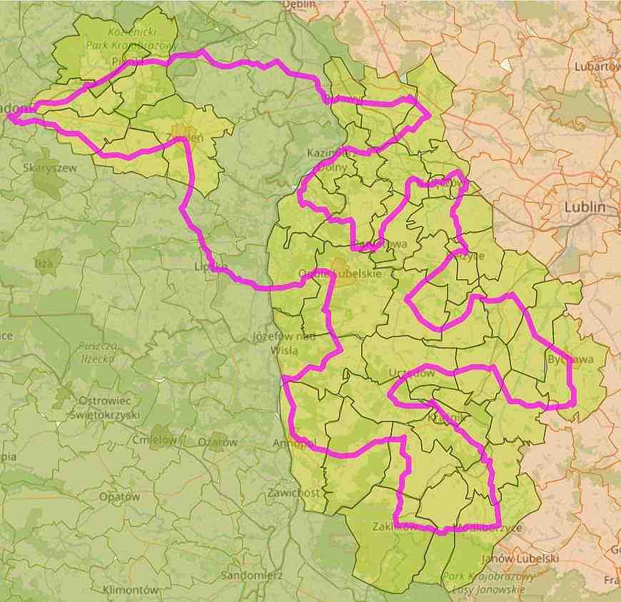 Most w okolicy Solca otwiera przede mną nowe możliwości. "Puste" przebiegi skończyły się. Na mapie zaliczonych do tej pory gmin to dla mnie biała plama. Przekraczając Wisłę wjeżdżam do województwa lubelskiego. Lubelszczyzna wita mnie szutrowymi drogami prowadzącymi wzdłuż (lub przecinające je) ciągnących się kilometrami sadów. W okresie dojrzewania owoców ten odcinek drogi byłby o wiele bardziej smakowity. Gruboziarniste, kamieniste podłoże psuje przyjemność z szutrowej trasy. Po zaliczenie kilku gmin wracam na asfalty prowadzące doliną rzeki.