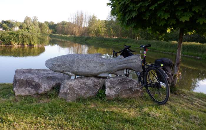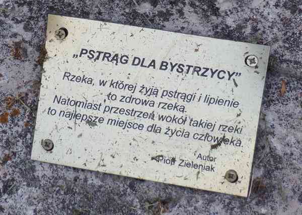 Zbliżam się do miejsca (Zakrzówek) gdzie wg Google Maps znajduje się "Pomnik Karpia". Początkowo nie zwracam uwagę na kształt wykutej w kamieniu ryby. Dopiero tabliczka wyjaśnia, że to pstrąg. Rzeczywiście wysmukła ryba karpia nie przypomina. Zatrzymuję się na kilkanaście minut by nad pobliskim stawem posilić się przed dalszą jazdą. Na obiad mam zabrany ze sobą makaron z dżemem. Uzupełniam w pobliskim źródełku zapasy wody. Kilka kilometrów dalej mijam półmetek ultramaratońskiej trasy.