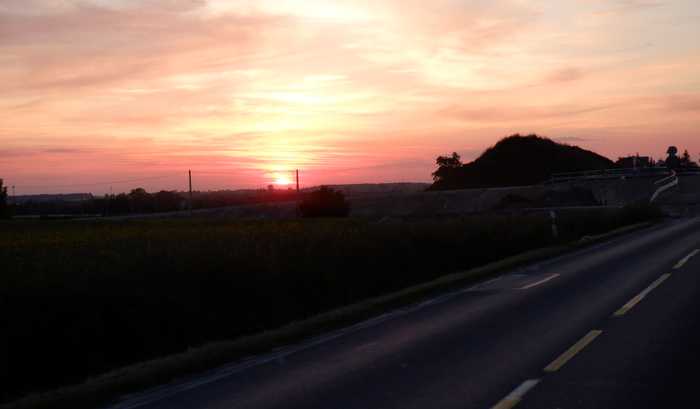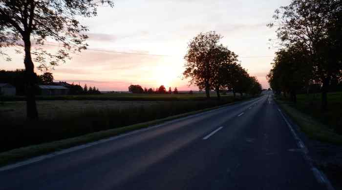Upału nie ma ale niepokój budzi perspektywa uzupełnienia zapasu płynów (3 litry nie wystarczą na całą trasę). Moje obawy są zupełnie nieuzasadnione. Pomimo święta otwarte sklepy będę spotykał na całej trasie. Ostatni minę przed godziną 22. Zatrzymuję się przed najbliższym. Później uzupełnię wodę w przycmentarnym hydrancie. Wreszcie w wypatrzonym na Gogle Maps źródełku. 7 litrów płynów z powodzenie wystarcza nawet na powrót pociągiem. Rozkoszuję się równym asfaltem. Dzisiaj TIR-y nie będą zakłócać jazdy nawet na głównych drogach.