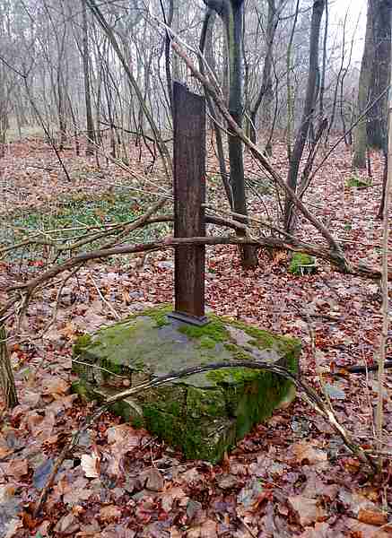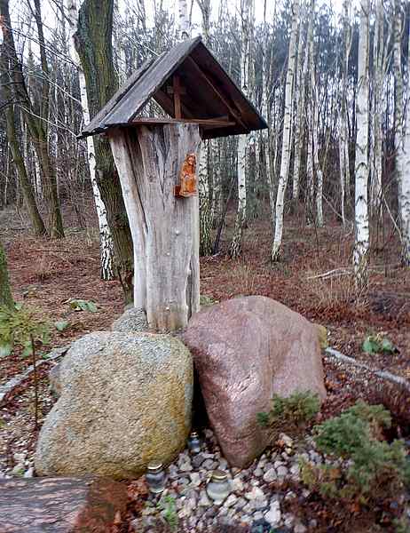Ponownie trafiłem na zbiorowisko blisko polożonych punktów. Dziwnie okrężną drogą przez las docieram do miejscowości Chrośno i odnajduję imponujące wielkością drzewo. Dość intuicyjnie odnajduję kolejny obiekt czyli staw. Ponieważ teren nad stawem jest zagospodarowany przez znajdującą się obok agroturystykę obstawiam, że z 90% pewnością trafiłem w odpowiednie miejsce. Kilkaset metrów dalej obok tej samej drogi znajduję cmentarne wzgórze poznane z okazji wspomnianej powyżej wycieczki po mogilach i cmentarzach z I wojny światowej. Odnalezienie porośniętych mchem nagrobnych płyt nie jest oczywiste.