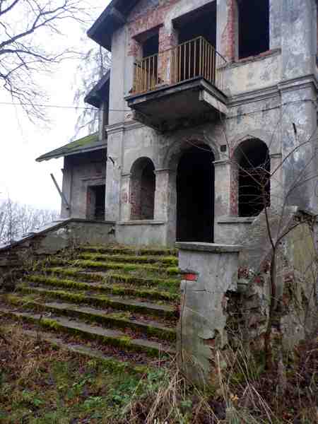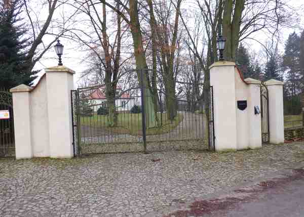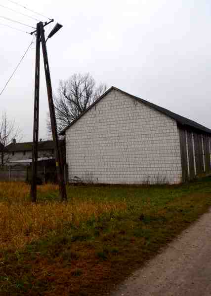 Skręcam w boczną drogę i mam problem czy ta jedyna w tym miejscu latarnia jest naprawdę zepsuta a może to nie jest ten obiekt [Zepsutej lampy 69 już nie ma była naprzeciwko tej ze zdjęcia]. Aplikacja rozwiązałaby ten dylemat przez krótkie "pipnięcie". Dróżka przez las, krótki odcinek suchego zaoranego pola i zatrzymuję się przed "zamczyskiem" a właściwie zamkową bramą do zabudowań miejscowego rolnika. No cóż ma facet fantazję. Zamczysko to ściema, opuszczony stary dwór jest już jak najbardziej realny.