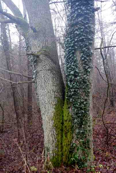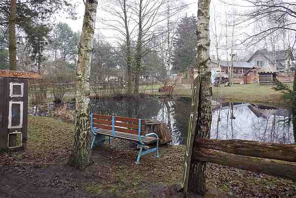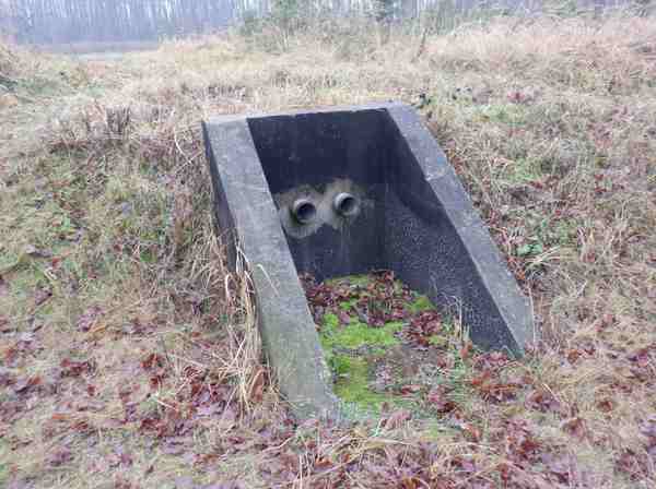 Leśna droga doprowadza mnie do stawu stanowiącego punkt czerpania wody. Do czego służą umiejscowione wyjątkowo wysoko rury trudno zgadnąć. Prosta droga przez las powinna mnie doprowadzić do kolejnego punktu. W zarośniętym lesie trudno wypatrzyć charakterystyczne punkty (ścieżki). Które z drzew jest przysłowiowym dla orientalistów "drzewem w środku lasu". Jadąc z aplikacją nawet nie widząc obiektu usłyszałbym charakterystycznej "pipnięcie". Nie mam czas na namierzanie punktu. Chociaż wydaje się że jestem w odpowiednim miejscu być może zdjęcie jednego z kilku podwójnych dębów należy traktować jedynie jako zdjęcie ilustracyjne.