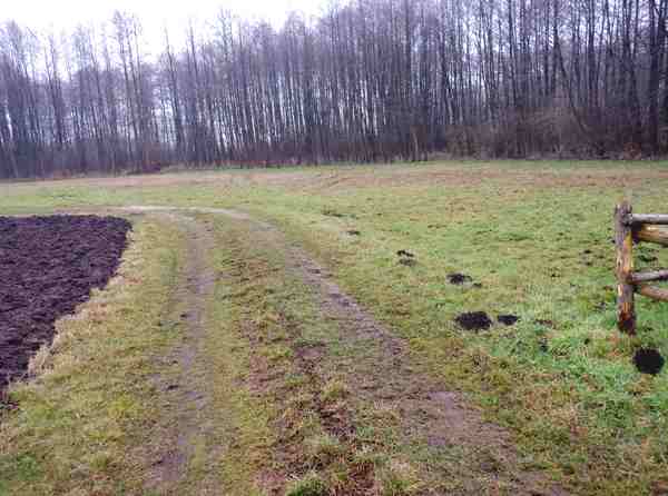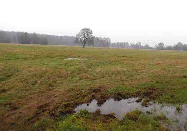 Pokonuję, tym razem w przeciwnym kierunku, czyli pod wiatr kilka kilometrów asfaltowej drogi. Wiem, że dalsza gruntowa droga, wkrótce za ostatnimi zabudowaniami skończy się na łąkach. Wielokrotnie latem przedzierałem się przez te łąki docierając do asfaltowej drogi prowadzącej pomiędzy hodowlanymi stawami w miejscowości Sarnów.