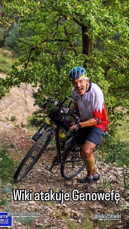 Radość z pokonania trudniejszego odcinka trasy przez rezerwat szybko się kończy. Przejeżdżam mostem w Bobrownikach na północny brzeg rzeki i wkrótce przeżywam szok na widok imponującego, bo wznoszącego się kilkanaście metrów powyżej brzegu rzeki skalistego wzniesienia. To góra (podobno świętej) Genowefy. Zupełnie o niej zapomniałem. W czasie pierwszej edycji podejście pokonywałem już w ciemnościach nocy. Teraz nie da się w samotności walczyć z terenem. Wysoko na szczycie widzę organizatora oraz głównego fotografa imprezy. Niby dopingują zawodników, a w rzeczywistości jak sępy czekają by napawać się zmaganiami z ciężkim, stromym podejściem. Kiedy próbuję znaleźć jakieś łagodniejsze obejście stromego podejścia, nie umyka to uwadze Mario, który przypomina, że powinienem poruszać się ściśle po otrzymanym śladzie. Wypych prosto w górę wydaje się zadaniem nierealnym i niemożliwym do zrealizowania, jednak muszę podjąć się tego wyzwania. Pomijam żarty, że powinienem tam wjechać nie zsiadając z roweru.