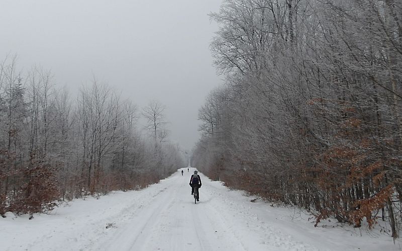 Chwila jazdy pokrytą śniegiem asfaltową drogą i zanurzam się w leżących na wschód od Suchedniowa lasach Puszczy Świętokrzyskiej. Niby trasa jest oczywista ale na długości kilkuset metrów pokrywa się z drogą powrotną. Zgodnie z tym co zapamiętałem najpierw wybieram lewą, a później prawą odnogę śladu. Kiedy będę wracał wybór trasy nie będzie już tak oczywisty. Jeden bikerów w drodze powrotnej pomylił się w tym miejscu i zaczął zjeżdżać prosto do Suchedniowa. Bolesna pomyłka dodatkowe kilometry dystansu i metry przewyższenia.