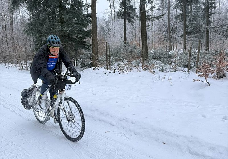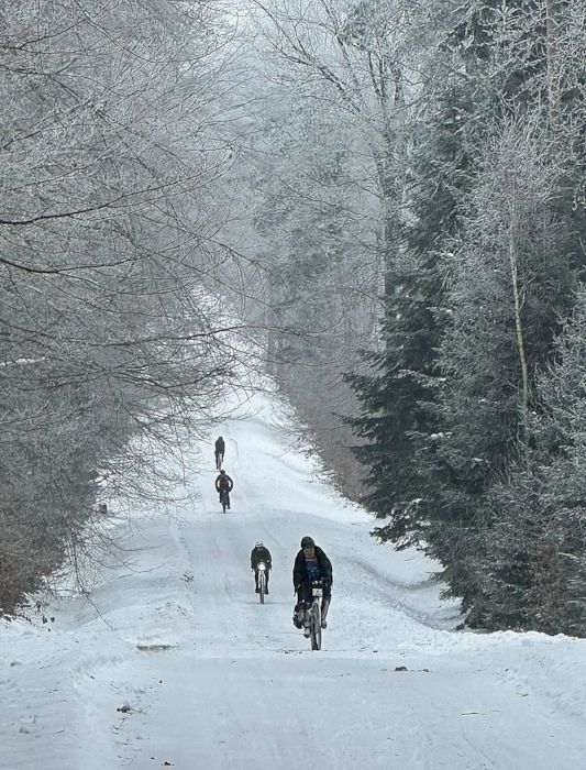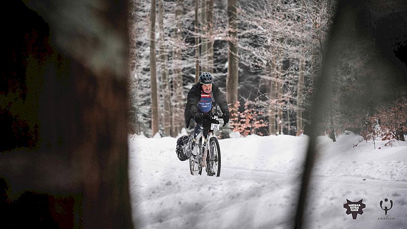 Chwila oddechu i powrót do lasu. Kolejne koleiny leśnych dróg. Jazda w takich warunkach nie jest najszybsza i najprzyjemniejsza. Mimo wszystko czuję pozytywną energię. Świadomość, że zbliżam się do półmetka zmagań i punktu żywnościowego dodaje sił. Od dłuższego czasu już nie jem (wcześniej jedynie dwa banany i kilka batonów). Zamarznięty ustnik sprawia, że od początku nic nie piłem. Teraz kiedy z każdym kilometrem zbliżam się do wyżerki, nie ma sensu się zatrzymywać, przecież dotychczas pokonałem jedynie 100 km.