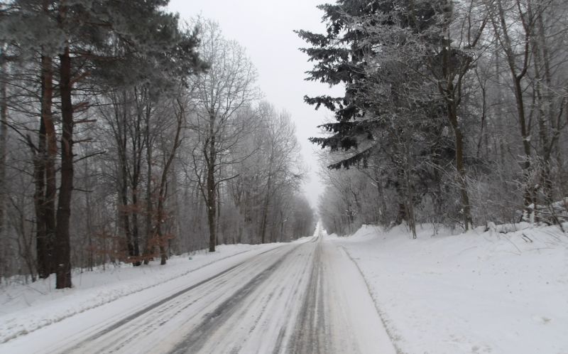 Wkrótce opuszczam zwarte tereny leśne. Droga krajowa, tory kolejowe, miejscowość Gilów wg rozpiski na kierownicy oznacza, że pokonałem pierwsze 20 km trasy. Teraz tereny leśne i szutrowe lub polne drogi będą się przeplatały z asfaltami, z wyraźną przewagą tych ostatnich. Słowo asfaltowa droga ma tu umowne znaczenie. Drogi krajowe i te częściej uczęszczane mają czarną nawierzchnię. Te "mniej główne" ale uczęszczane mają wyjeżdżone 3 wąskie pasy odsłoniętego asfaltu. Boczne mogę mieć tych pasków dwa, a często w poprzek pojawiają śnieżne muldy ubitego śniegu. Na lokalnych drogach normą jest warstwa ubitego, czasami wyślizganego przez samochody śniegu.