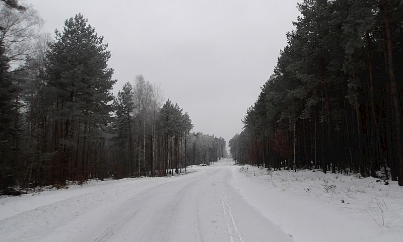 Po kolejnych kilometrach opuszczam przysuskie pagórki i związane z nimi ciężkie podjazdy i szybkie niebezpieczne zjazdy. Znikają odśnieżone dukty. Zamiast tego pozostają jedynie odciśnięte w śniegu głębokie, często wyślizgane koleiny ciężkiego leśnego sprzętu. W wielu miejscach trudno utrzymać się na kołach. Niewielka prędkość sprawia, że utrata równowagi kończy się na kontrolowanym podparciu wysuniętą nogą lub upadku w miękki zalegający środek drogi i pobocze śnieg.