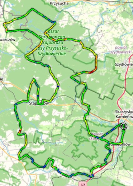 Zjazd w suchedniowskie lasy niewiele poprawia termikę. Na płaskich leśnych duktach trudno się dostatecznie rozgrzać. Przebieranie na kilkanaście kilometrów przed metą nie wydaje się celowe. Chwila zastanowienia na rozdrożu rozwidlającego się śladu i po chwili zmierzam już prosto w kierunku znajdującej się w Skarżysku-Kamiennej mety.