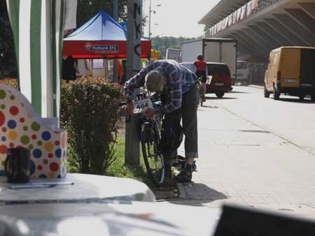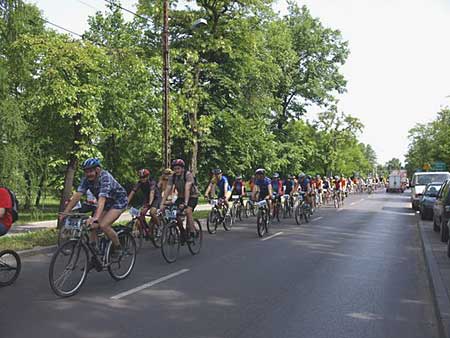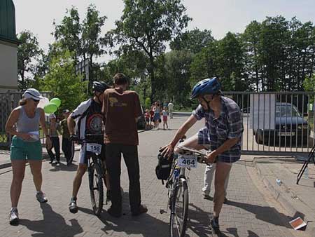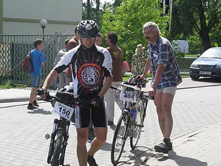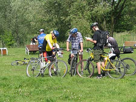 Na miejscu spotykam wielu znajomych. Z jednym z nich Robertem Bobińskim pokonamy całą trasę. Start honorowy, przejazd gdzieś do miejskiego parku. Tu dostajemy mapy, a po ok. 15 minutach następuje start ostry. Przed nami najtrudniejszy moment, decyzja o wyborze trasy. Gorączkowo oglądamy punkty, których nie potrafimy ułożyć w jakiś logiczny sposób. Do debaty o trasie dołącza (chociaż pojedzie własnym wariantem) znajomy z pobliskiego Piastowa - Leszek Bulski. Najbliższy punkt (PK6) zostawiamy do zaliczenia na samym końcu. Na początek pójdzie jeden z dwóch punktów PK3 lub PK8. Nieznajomość sporego miasteczka sprawia, że instynktownie wybieram najmniej problematyczny wariant jazdy w kierunku północno-zachodnim - pobliskie tory kolejowe są raczej łatwe do zauważenia. Ruszam za licznymi bikerami jadącymi właśnie w tym kierunku. W ostatniej chwili do naszej dwójki dołącza Marek Bieliński, średnio znany mi biker i piechur z Warszawy. Zwykle to ja prowadzę i nie zawsze jest to najbardziej szczęśliwe wyjście, szczególnie gdy robię błędy i żaden z moich towarzyszy tego nie koryguje. Skąd ja to znam - wielokrotnie mi się to przytrafiało na imprezach na orientację, gdy to ja jechałem z tyłu.