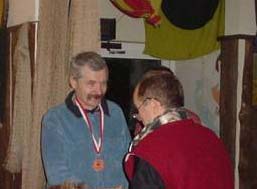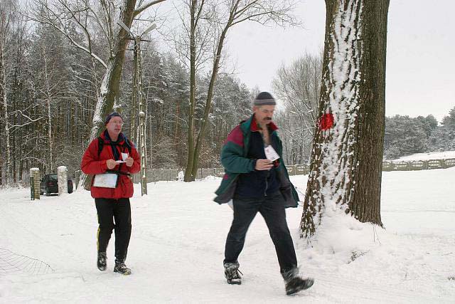 Dziurkowanie karty, zapis numeru i czasu przez sędziego i bez namysłu ruszam drogą w kierunku PK6. Jedyne utrudnienie najbliższych 4 kilometrów to zmrożona, ubita przez pojazdy, nierówna i zdradliwie śliska nawierzchnia leśnej drogi. Dalej trzeba zejść z twardej nawierzchni i przez zasypane śniegiem łąki dotrzeć do myśliwskiej ambony. Zadanie okazuje się prostsze od wszelkich przewidywań. Szukam śladów osób które przechodziły tędy przede mną. Do punktu wiedzie ścieżka przedeptana w sypkim śniegu przez ponad 20 zawodników. Nie ma wyboru - warstwa śniegu która wynosi zwykle 10-15 cm na porośniętych trawą łąkach sięga nawet do pół łydki. - przecieranie nowego nawet krótszego dojścia do punktu nie wchodzi w rachubę. Niespodzianką jest biegnący w poprzek, dość szeroki rów wypełniony wodą. Warstwa śniegu nie ułatwia znalezienia optymalnego (węższego) miejsca do jego pokonania. Próbę taką kończę z jedną nogą do pół łydki zanurzoną w wodzie. Wycofuję się, przesuwam do przedeptanej ścieżki, biorę rozbieg i ląduję na drugim brzegu przysłowiową "suchą stopą". W oddali widzę 2 myśliwskie ambony i sylwetkę zawodnika opuszczającego jedną z nich. To tam znajduje się poszukiwany przeze mnie PK6.