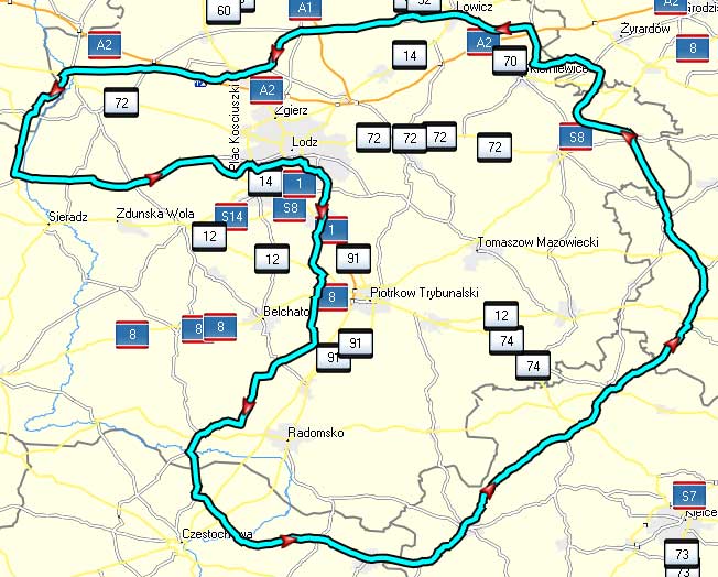 Mijam Łowicz, Piątek. Wiatr ani na chwilę nie chce ustąpić. Chwila oddechu gdy skręcam na południe. Ozorków. Jedzie mi się całkiem dobrze - czyżby wiatr nieco zelżał. Prognozy jednak się sprawdziły. Czas na modyfikacje trasy, tak by uzyskać pożądaną jej długość. Pomimo przeciwnego wiatru w dalszym ciągu jadę na zachód. Najbliższy cel to Uniejów. 100 km pod wiatr wystarczy na dzisiaj. Jadę wzdłuż Warty na południe. Mijam zalew Jeziorsko. Od celu dzieli mnie zaledwie 70 km.