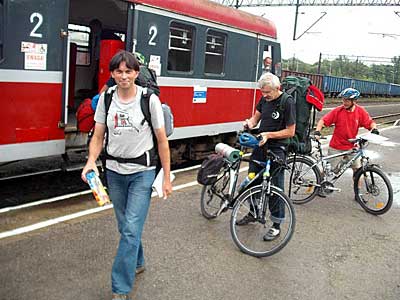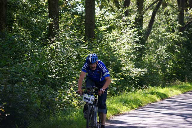 Chociaż zwykle wożę dwa zapasy, tym razem był tylko jeden. Najpierw więc muszę skleić jedną z dziurawych dętek. Okazuje się, że nie jest to takie proste. Pompowanie nie pomaga znaleźć w dętce dużej dziury. Poszukiwanie wody kończy się przy odległej o kilkaset metrów kałuży (a gdyby nie padało?). Przyklejam łatkę. Pompuję. Bez skutku. W dobitej na zjeździe dętce znajduję kolejną szparę. Ostatnia niewielka łatka na ląduje szerokim na 5 mm przecięciu. Wątpliwe miejsce wzmacniam taśmą klejącą. Na razie trzyma. Kłopoty z dętką sprawiają, że ilość czasu jaka pozostała na powrót do bazy radykalnie się zmniejszyła. Obok obaw o zmieszczenie się w limicie czasu dochodzi niepokój czy w ogóle samodzielnie wrócę na metę (dętka wytrzymuje dojazd do mety, dojazd na stację PKP i zwiedzanie Wrocławia, 5 km. ze stacji kolejowej do domu muszę już "dymać" pieszo).