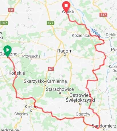 Utrudniające początkowo jazdę "kieleckie" pagórki powoli wypłaszczają się. Przed wieczorem osiągam wysuniętą najbardziej na północ gminę Obrazów (tuż obok, po przeciwnej stronie rzeki znajduje się Sandomierz). Chociaż północny wiatr nieco osłabł to niezauważalnie będzie mnie wspierał. Jego obecność odczuwam gdy momentami trasa zakręca w przeciwnym kierunku.
